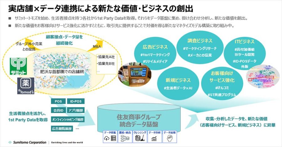 またリテールデータを活用した、メーカー・小売業向けの新たなマーケティング事業にも挑戦する。現在サミットは124店、トモズは265店の店舗網を持ち、年間延べ2億回以上の生活者との接点がある。購買頻度の高いスーパーとドラッグストアの「食」と「健康」のデータから得られる首都圏の会員500万人の生活に根差した購買データに加え、顧客との関係性を通じて得られる定性データも活用し、新たな価値の創出を目指す。