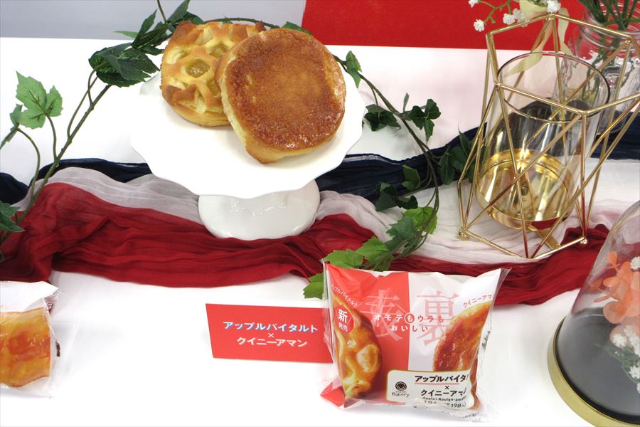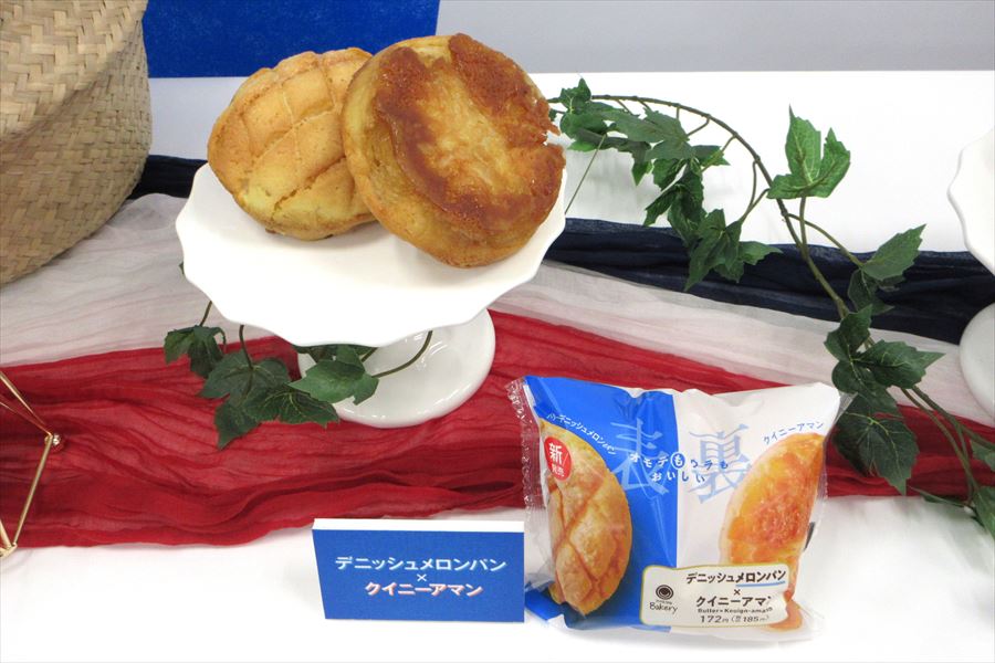ラインアップは、「デニッシュメロンパン×クイニーアマン」(税別172円)、「チーズケーキデニッシュ×クイニーアマン」(184円)、「アップルパイタルト×クイニーアマン」(184円)の3種類。表側は老若男女に人気のスタンダードなパンを選定。その裏側にクイニーアマンを合わせることで、新たな味わいに仕上げた。クイニーアマンの食感はパンごとに変えることで、それぞれの個性を楽しめる仕様にこだわった。