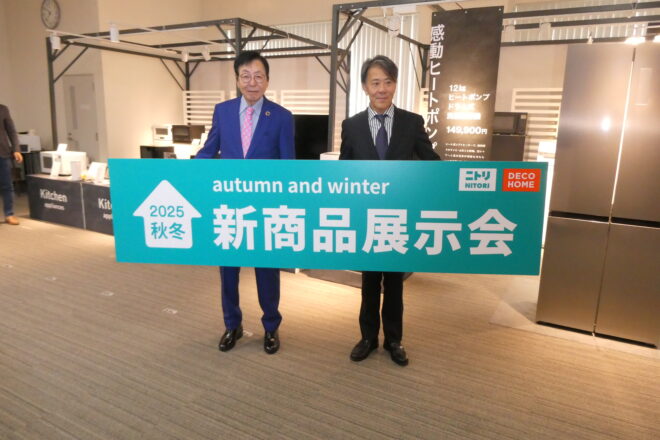 ニトリでは、家電売り場の導入店舗を将来的には全店に進めていきたい意向だが、現在、2000店舗うち約6割が新しい売り場に変わっている状況だ。店舗の大きさによって、取れる売り場面積は異なるが、「面積を大きくとっている大型店舗の効率は確実に上がってきている」と永井弘常務執行役員(冒頭写真・右)は説明。大型家電の売り上げは、これまでの一人暮らし用のエントリーモデルではなく、ファミリー層が支持する品揃えの拡充により拡大。ニトリは今後も家電をフックにファミリー層を中心とした顧客の裾野拡大に力を入れる意向だ。