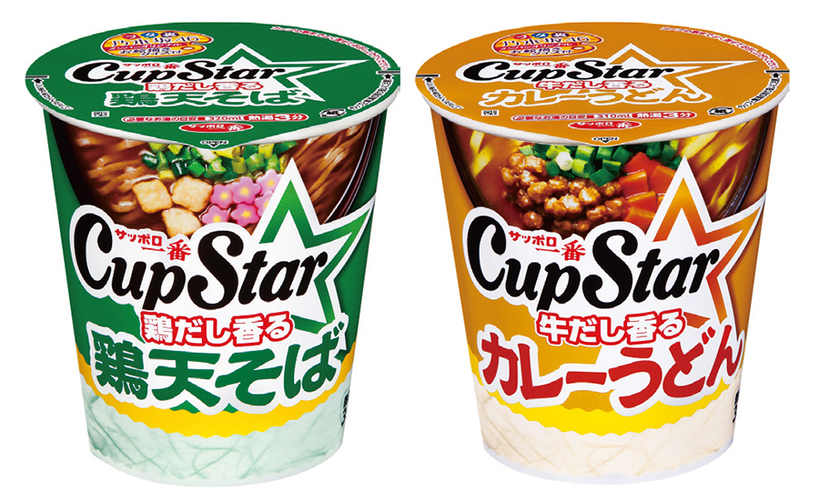 左から「サッポロ一番 カップスター 鶏天そば」、「同 カレーうどん」