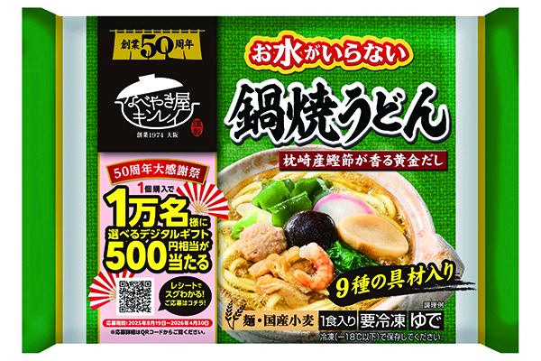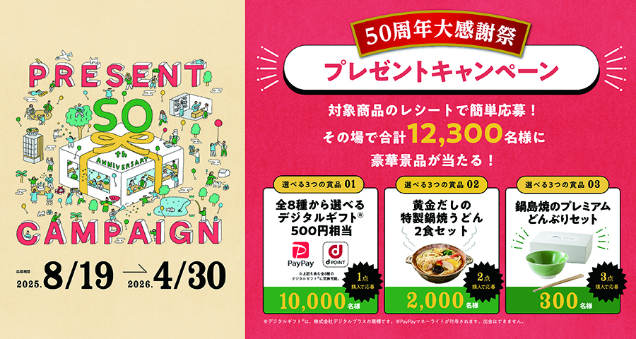 そこでキンレイは今期、創業50周年に合わせた大規模な消費者キャンペーンを展開中だ。総勢1万2300名へのプレゼント企画を来年4月30日まで実施。景品にはデジタルギフトや特製鍋焼うどんセットなどを用意している。
