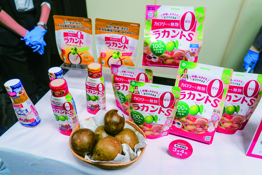 サラヤが2026年の取引先向け方針発表会において、来春発売する新商品とリニューアル品を明らかにした。25年10月に閉幕した大阪・関西万博ではパビリオン「ブルーオーシャン・ドーム」を支援し、多くの来場者に海に関する課題を共有するなど、積極的な情報発信に努めた。ポスト万博となる26年は、今年30周年を迎えたカロリーゼロの植物由来甘味料「ラカント」のリニューアルを始め、社会課題解決型商品を食品、生活用品の両分野で打ち出す計画だ。コンシューマー事業本部の山田哲取締役本部長(冒頭写真左)は挨拶の中で、「未来を切り開くSDGsカンパニーとして、衛生・環境・健康の3部門でお客様の課題を解決していく」と力を込めた。