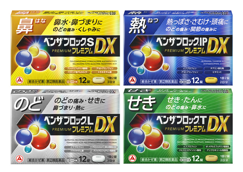 こうした背景を踏まえ、新シリーズでは、症状別の〝優れた効き目〟を追求。新登場・緑の「ベンザブロックTプレミアムDX」では、のどの痛みをおさえ、熱を下げるための成分「イブプロフェン600mg」のほか、せきをしずめたり、たんを排出しやすくする「dl-メチルエフェドリン塩酸塩」など8種類の有効成分を配合する。