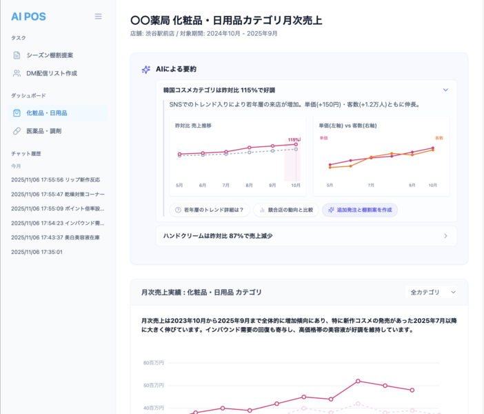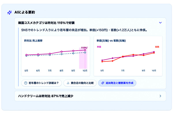 さらにグラフやダッシュボードには日本語で解釈が添えられ、専門知識がなくても「何が起きているか」を一目で把握できるほか、AIチャット機能を活用すれば、気になる商品やカテゴリーごとの状況を深掘りでき、担当者が直感的に操作しながら必要な分析結果を得ることができる。分析に留まらず、施策のレコメンドまで一気通貫で提供する点も大きな強みだ。