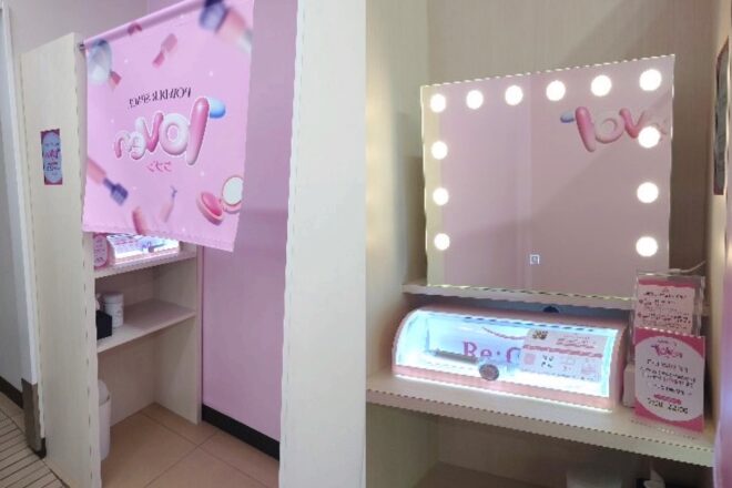 無料で入れる「ラブン」内には、ヘアアイロンのレンタルスポット「ReCute」(有料)を展開し、ライトを3段階に切り替えられる「調光付きライトミラー」を設置するなど、外出前や学校・仕事帰りに、気軽に身だしなみを整えられる環境を提供している。