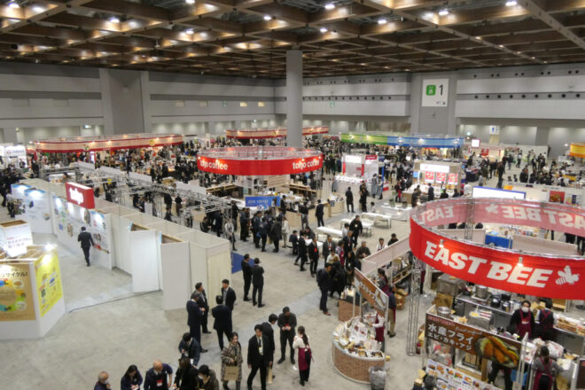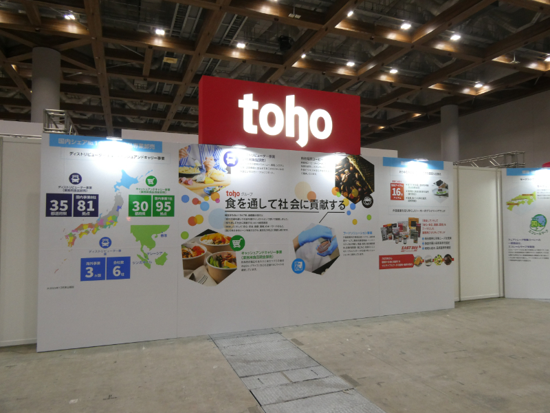 会場は、入口正面にサステナビリティへの取り組みを紹介する大型パネルを設置。その先に、「自社焙煎(toho coffee)」「素材品(生鮮三品)」「オリジナル提案(外食シーン別メニュー)」「フードソリューション」「PB商品(イーストビー)・新商品」の五つのテーマ別コーナーを展開した。