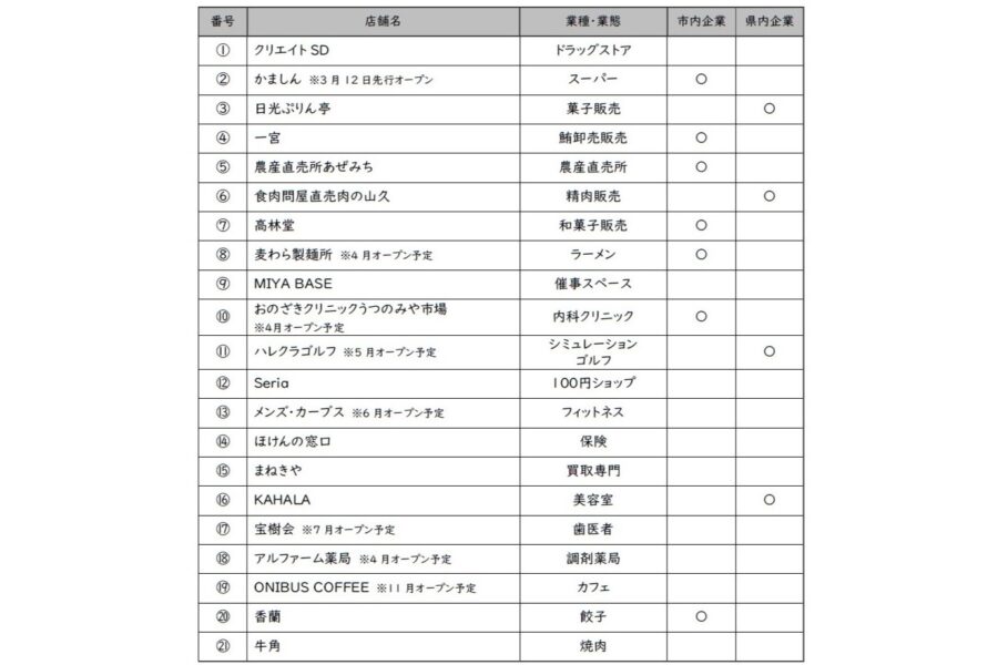 食の専門店ゾーンには、宇都宮市内の企業が展開する農産直売所や肉・魚の専門店、菓子店、ラーメン店などが出店する。イベントゾーンでは、大屋根広場や芝生広場を活用し、マルシェや地域イベント開催などを予定している。