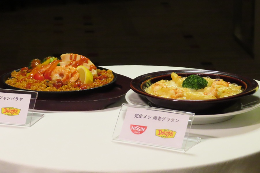 「完全メシ×デニーズ」は、ファミリーレストランのデニーズジャパンとのコラボメニューで、「ジャンバラヤ」(税別1290円)と「海老グラタン」(同1090円)の2種を開発。25日から一部店舗を除く全国のデニーズの店舗のグランドメニューとして販売する。