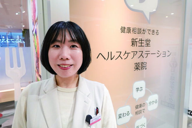 2024年9月には、調剤薬局・健康相談や測定・レストランを一体化させたコンセプトストア「新生堂ヘルスケアステーション薬院」(福岡市中央区)をオープン。150坪の店内に三つの機能を集約した新業態を立ち上げた。同店マネジャーで管理栄養士の田中里枝氏(冒頭写真)は「処方箋がなくても立ち寄れる場所というのがヘルスケアステーション構想の考え方。薬院ではそれを具現化するための挑戦として、薬と生活習慣カウンセリングと食事を一気通貫でサポートできる場所をつくった。メインターゲットである女性の健康ケアに特化して展開している」と狙いを明かす。