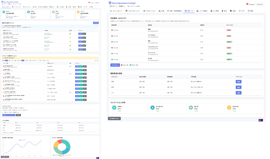 さらに棚に備えた小型カメラなどを活用することで、棚の状況を情報化。そこで得られたデータを最大限に生かすためのプラットフォームが「ヴジョンライブ」だ。過去の販売実績など各種情報を取り込むことで、店長向けのダッシュボードには、その日に実行するべき業務や、欠品状態を早く改善しないといけない商品とそれを補充しないことの見込みロス、棚割り提案などをAIが分析して表示してくれる。