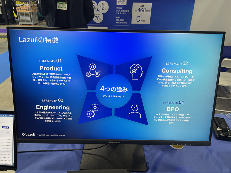 その中の1社、LazuliはNRFにも出展したベンチャー企業だ。同社の強みは対メーカー向けにはテキスト、画像、PDFを自動収集してAIが登録作業を構造化する。流通業に対しては、ECなど各種チャネルへのフォーマットに商品情報を自動変換する。また商品説明文からタグも生成、顧客ニーズに対する商品情報の最適化にもつながることから、メーカー、小売り双方からの引き合いが増えているという。