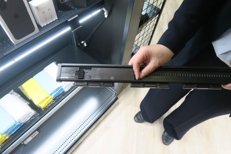 例えば電池不要の電子棚札(ESL)をレール側に備えたバッテリー経由で通電することで、電池切れによるESLの交換を省ける「エッジセンス」。さらにブルートゥースで接続されたレールが商品位置を自動的に特定し、小売業のアプリと連携すれば、お目当ての商品を探したり、EC注文のピッキング時などに、ESLを光らせて目立たせることができる。