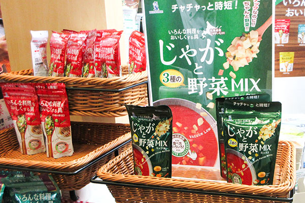乾燥野菜の新商品として「じゃがと3種の野菜MIX」(60g)を今春発売。北海道産じゃがいもを主原料に、玉ねぎ、かぼちゃ、にんじんを組み合わせ、真空低温フライ製法で野菜本来の風味を保ちつつ、食べやすく仕上げた。そのままでもスナック感覚で食べられるほか、水戻しでカレーやスープなど幅広いメニューに活用できる。ブルーチップはこうした商品開発のほか、販促サポートやアプリ開発、電気代削減の提案、保守料見直し提案、経験者のみを派遣するスキマバイトサービスなど、スーパーの経営を支援する全方向のサービスを広げている。