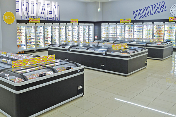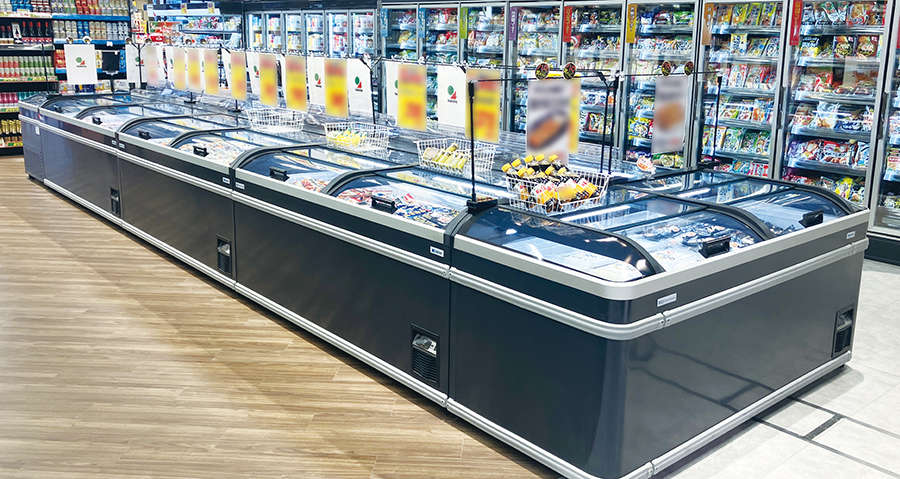 こうした性能の高さを評価する食品スーパー各社が続々採用を決めており、千葉県のせんどうは、木更津店(木更津市)の改装に合わせて、冷凍食品売り場を一新。「レイ-ザ・スタンダード」のアーバンを14台導入し、3列のアイランドを形成している(冒頭写真)。採用の決め手となったのが、省エネ性能の高さと、大掛かりな工事を必要としない施工性の高さだ。